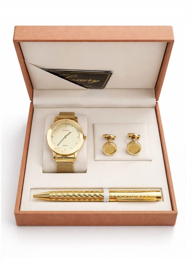 • محتويات الطقم: ساعة رجالية + قلم فاخر + كبك رجالي