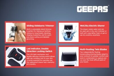 احصل على تجربة حلاقة مريحة ودقيقة مع ماكينة حلاقة رجالية قابلة للشحن جيباس GSR21N، المصممة لتلبية احتياجاتك اليومية في العناية باللحية والشارب.