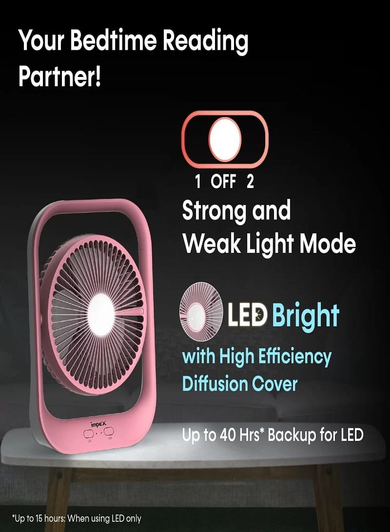 المروحة مزودة بمصباح ليلي بإضاءة LED في مقدمتها ويمكن إعادة شحنه أيضاً من خلال الطاقة الشمسية