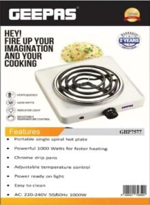 اصنع وجبتك المفضلة بكل سهولة مع موقد طباخة كهربائية جيباس GHP7577 المزودة بموقد حلزوني عالي الكفاءة، صُممت لتمنحك توزيعًا متساويًا للحرارة ونتائج طهي سريعة وفعالة. مثالية للاستخدام اليومي أو أثناء السفر والمخيمات، حيث توفر الطاقة وتضمن لك أداءً يعتمد عليه في كل مرة.