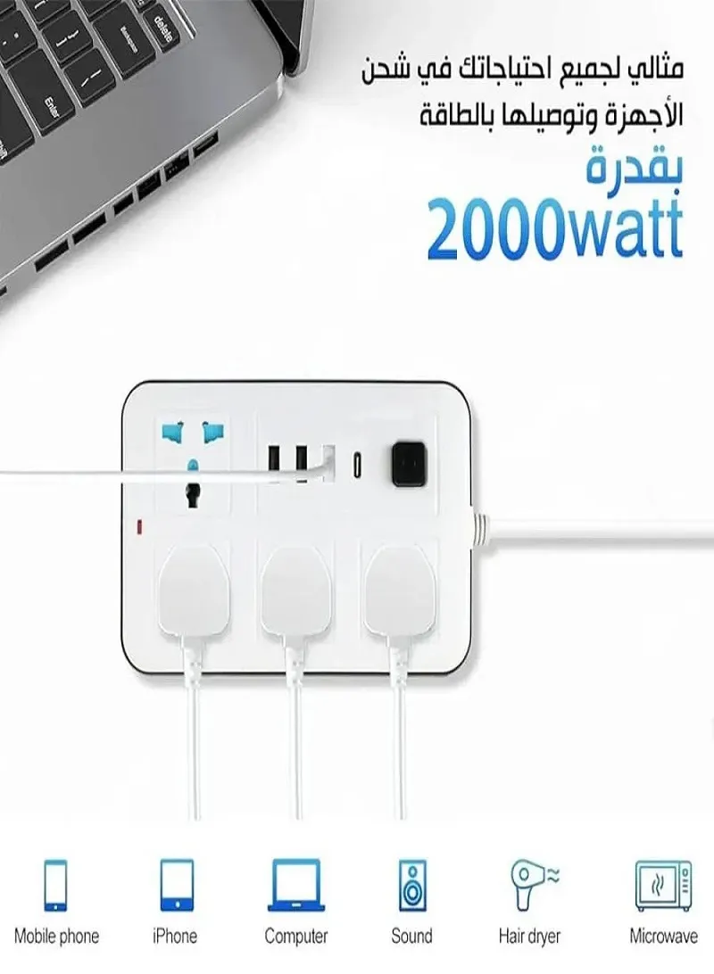 مرونة الوصول البعيد: بفضل الكابل الذي يصل طوله إلى 5 أمتار، لن تضطر بعد اليوم لتغيير أماكن أثاثك لتكون قريباً من مصدر الكهرباء.